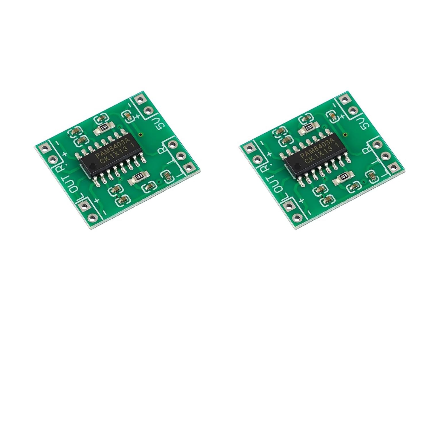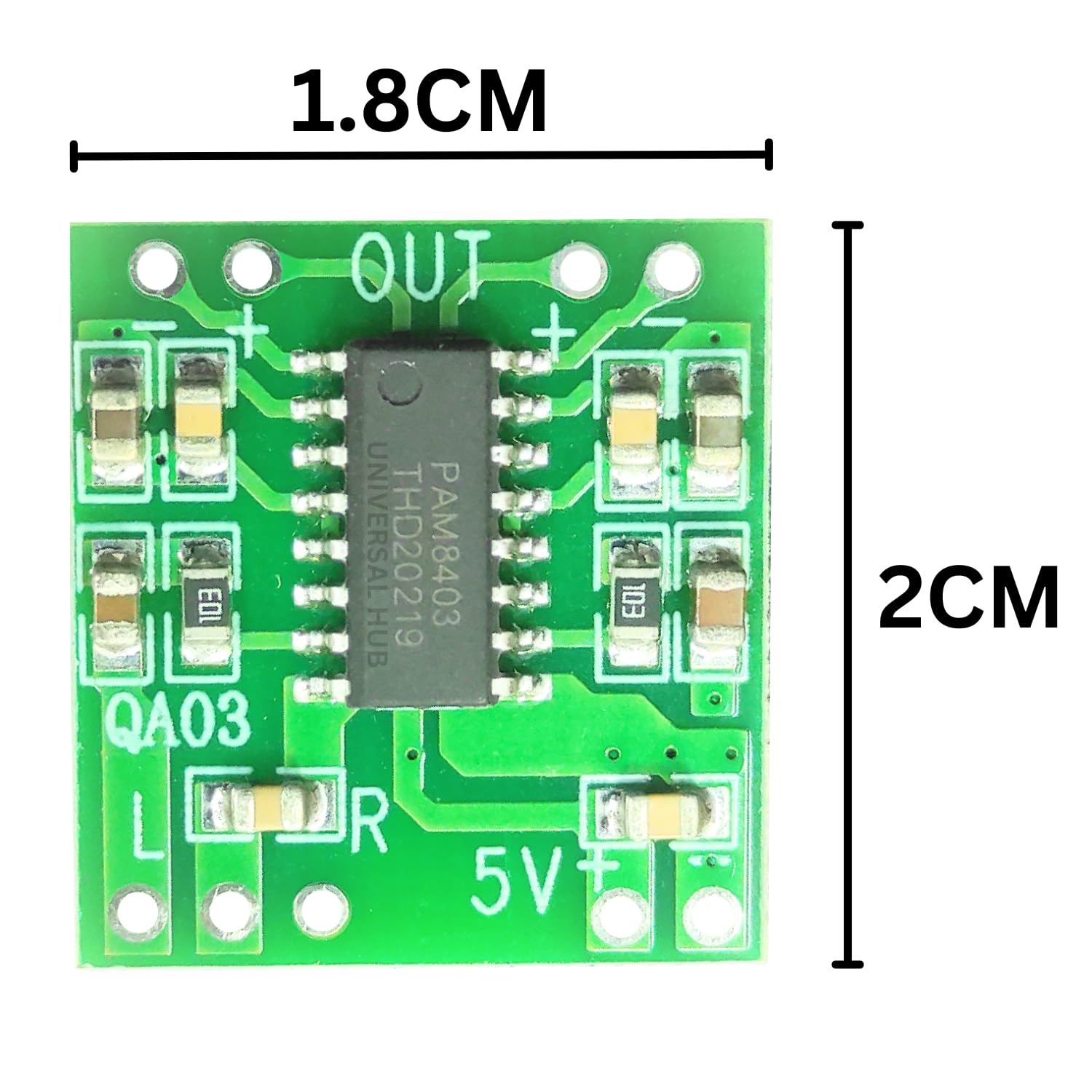 The PAM8403 Super Mini Digital Amplifier Board is a highly popular, low-cost solution for adding audio to small electronics projects. It is a Class D amplifier, meaning it is extremely efficient and generates very little heat despite its tiny footprint.