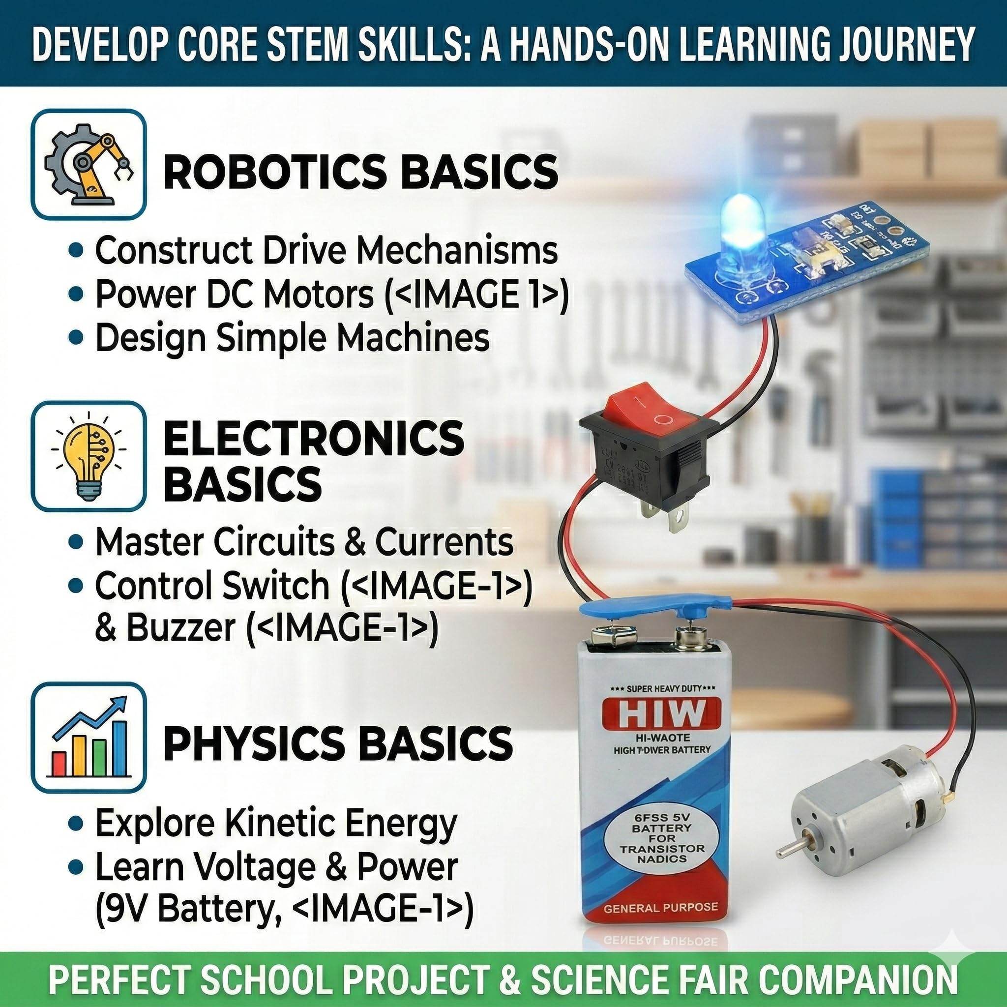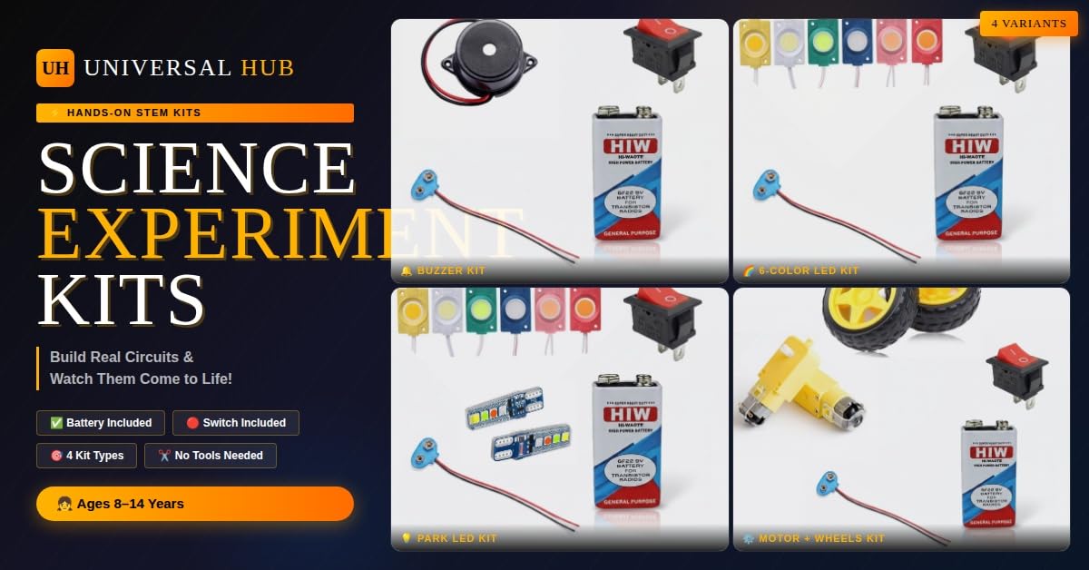 The Universal Hub School Science Project Kit is a comprehensive electronic experiment kit designed to ignite curiosity and hands-on learning in young minds aged 8-14 years. Perfect for students in classes 5th through 10th, this educational toy transforms abstract scientific concepts into tangible, interactive experiences. The kit includes an impressive array of components: LED modules in multiple vibrant colours (yellow, white, green, blue, pink, red), rocker switches, LED circuit boards, a 9V battery with connector, a buzzer module for sound experiments, two DC motors with matching robot car wheels, and connecting wires. With these versatile components, students can build multiple working models including light circuits, sound alarms, motorised vehicles, and various electronic experiments perfect for school exhibitions and science fairs. The kit helps children understand basic electronics, circuits, and engineering principles through practical application, encouraging problem-solving skills and creativity. All components come ready to assemble with simple connections, making it ideal for beginners to learn electronics without requiring advanced technical knowledge or soldering skills. This STEM learning kit makes science education both engaging and memorable, providing everything needed for countless project possibilities that combine learning with fun.