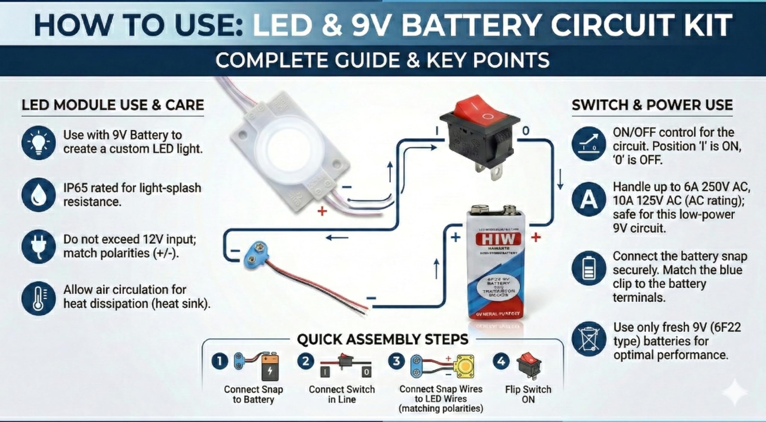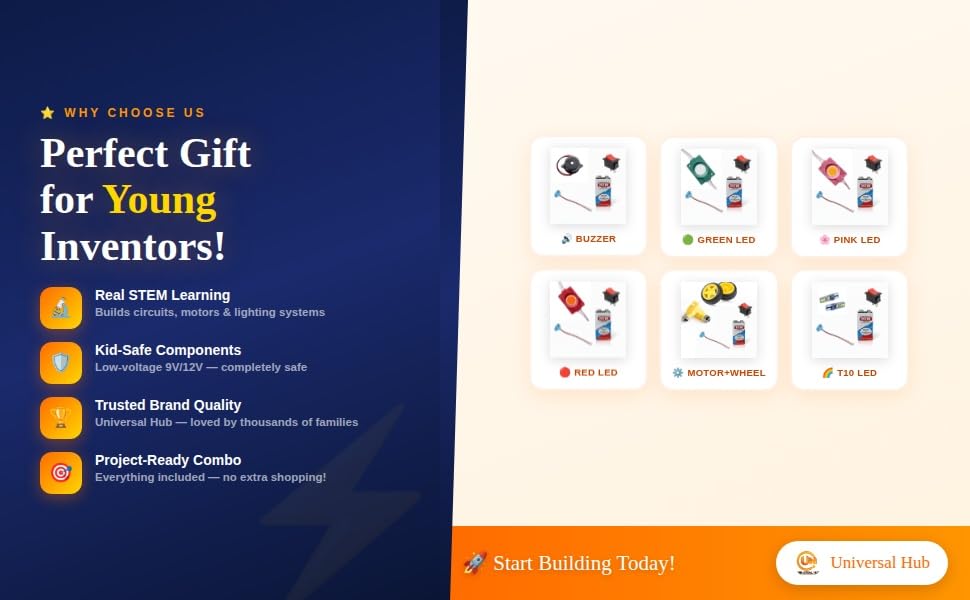 COMPLETE ELECTRONICS KIT: Comprehensive science project kit includes LED modules in multiple colours White , rocker switch, buzzer, 9V battery with connector, and various electronic components for hands-on learning, EDUCATIONAL VALUE: Designed for students in Class 5th-10th (ages 8-14 years), this experiment kit helps children understand basic electronics, circuits, and engineering principles through practical working models, VERSATILE PROJECT OPTIONS: Build multiple science projects including light circuits, sound alarms, motorised vehicles, and other electronic experiments perfect for school exhibitions and science fairs, EASY TO USE: All components come ready to assemble with simple connections, making it ideal for beginners to learn electronics without requiring advanced technical knowledge or soldering skills, IDEAL GIFT FOR YOUNG LEARNERS: Perfect educational toy for children aged 7-14 years who are interested in science, technology, and hands-on building activities that combine learning with fun