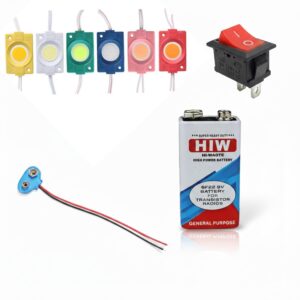 UNIVERSAL HUB COMBO OF 12V 6 COLOR (RED,GREEN,YELLOW,BLUE,WHITE,PINK) COIN LED Light Module Kit with 2 PIN ON/Off Rocker Switch, 9V Battery & Battery Clip Connector